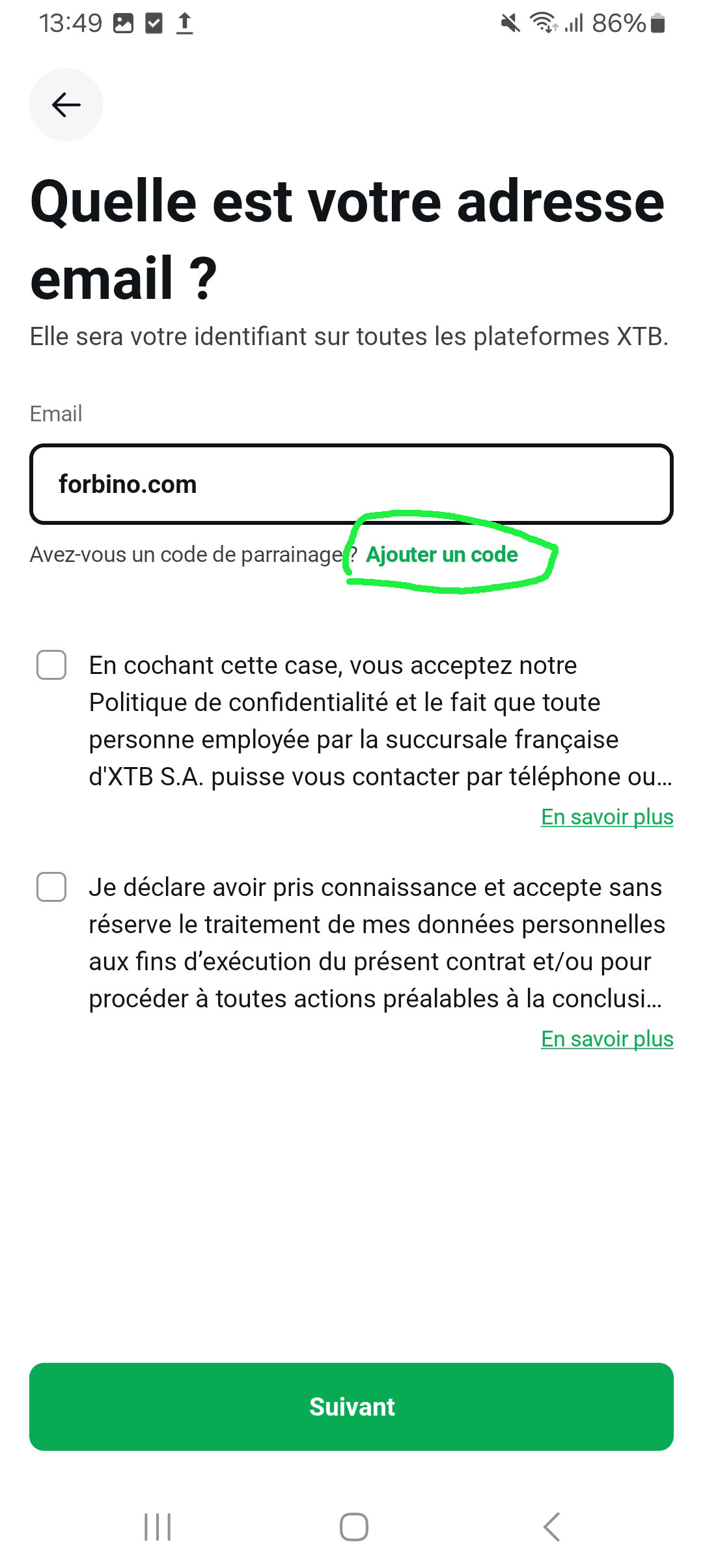 Exemple dans l’application XTB – saisie du Code de parrainage