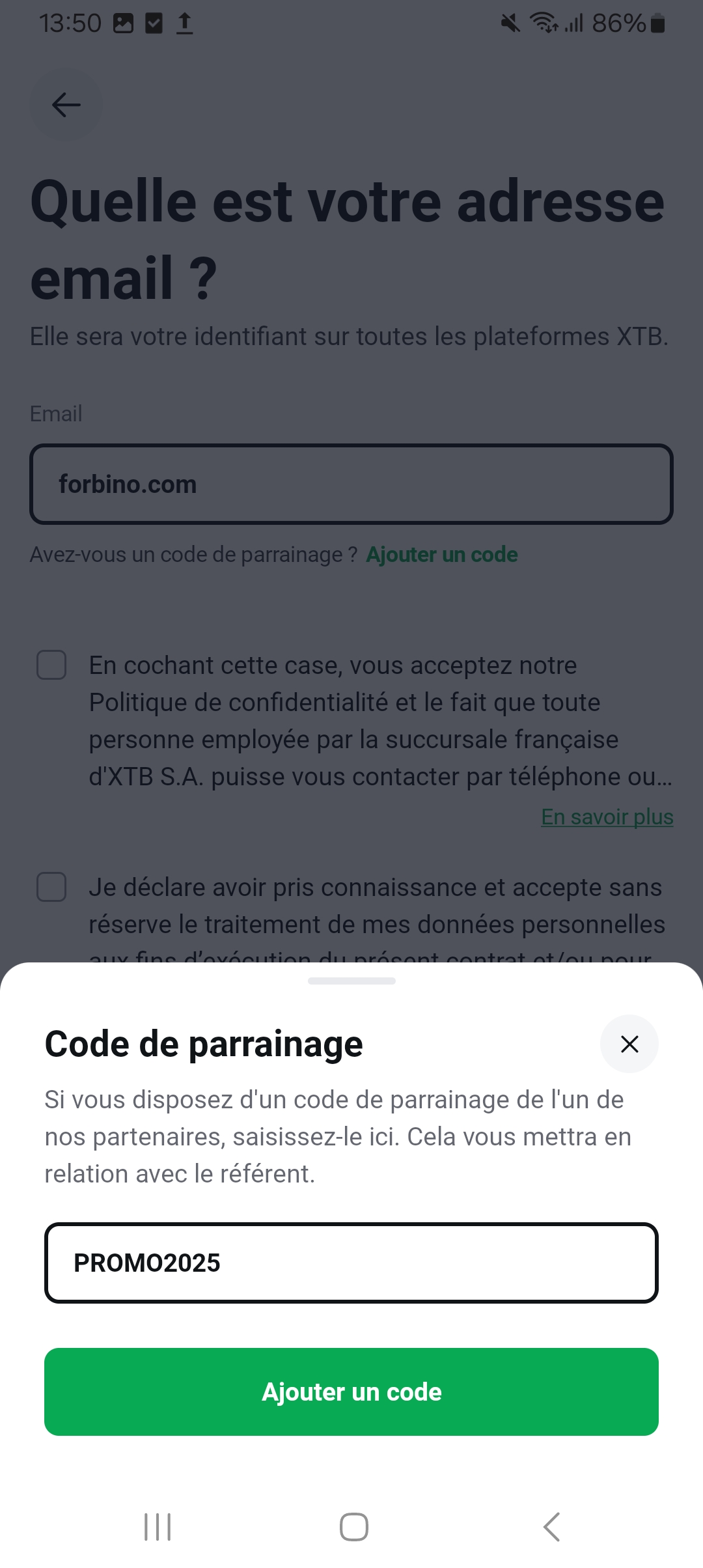- À l’étape suivante, saisissez votre adresse e-mail. Sous ce champ, vous verrez un lien vert « Ajouter un code ». Appuyez dessus et saisissez le Code de parrainage PROMO2025 Copié! , puis appuyez sur le bouton « Ajouter un code » pour l’enregistrer.