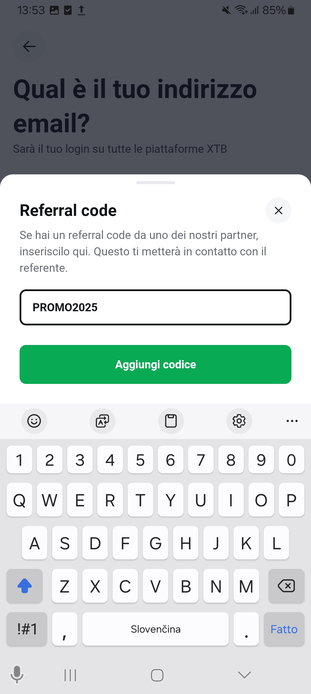 - Nel passaggio successivo inserisca il Suo indirizzo e‑mail; sotto questo campo troverà il link verde “Add code”. Tocchi il link e inserisca il codice referral PROMO2025 Copiato! , poi tocchi il pulsante “Add code” per salvarlo.