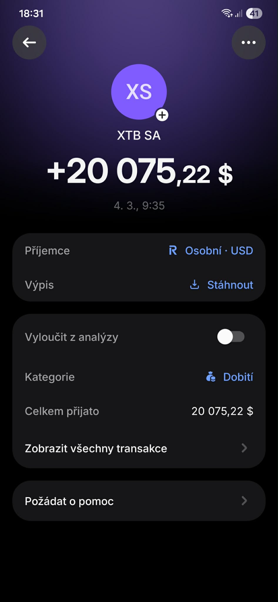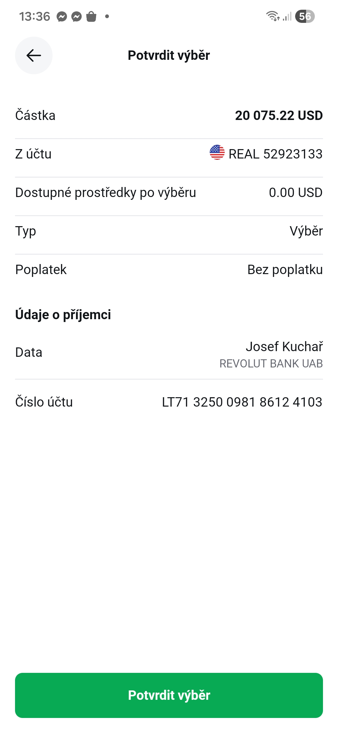 Na prvním printscreenu vidíte, jak jsem nahrál výpis z bankovního účtu pro ověření vlastnictví cílového bankovního účtu pro výběr. Další printscreen ukazuje, jak z mobilní aplikace XTB vybírám 20 075,22 USD. A poslední printscreen je z aplikace Revolut, kde je vidět, že mi přišla celá částka 20 075,22 USD, takže žádné poplatky za výběr nebyly strženy ze strany XTB ani korespondenčních bank.