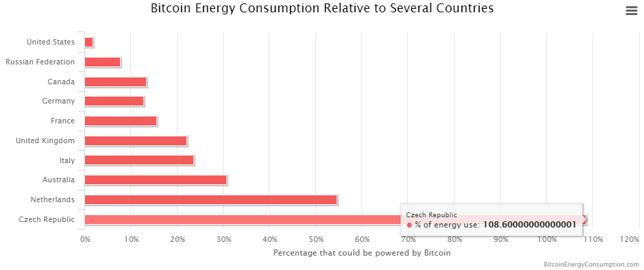 Na przykład Republika Czeska zużywa o 8,6% energii elektrycznej mniej niż sieć BitCoinu. Polska być może nie jest w wykresie, ale według publicznie dostępnych statystyk z 2015 roku energia elektryczna sieci BitCoin wystarczyłaby na pokrycie około 20% zużycia energii elektrycznej w Rzeczypospolitej Polskiej.
