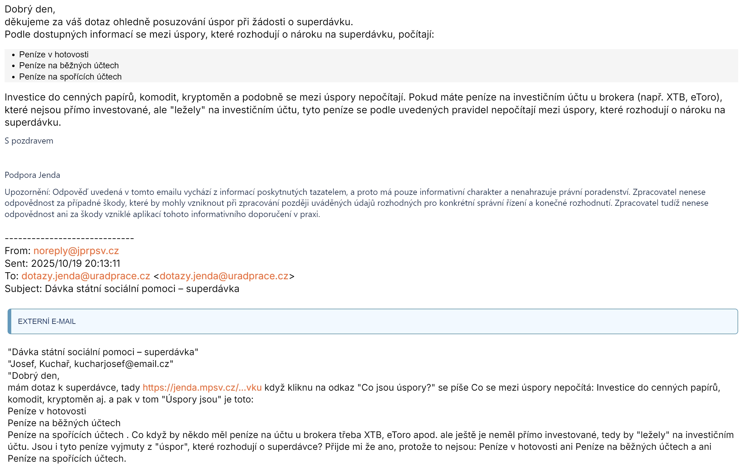 mám dotaz k superdávce, tady https://jenda.mpsv.cz/…vku když kliknu na odkaz „Co jsou úspory?“ se píše Co se mezi úspory nepočítá: Investice do cenných papírů, komodit, kryptoměn aj. a pak v tom „Úspory jsou“ je toto: